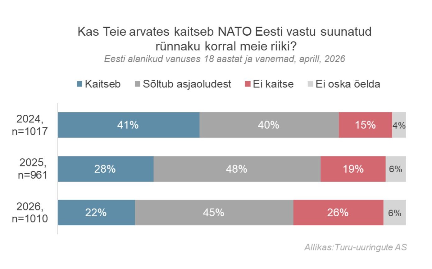 Usaldus on kahanenud järjepidevalt nii eestlaste kui ka muust rahvusest elanike seas. Eestlaste puhul on kindel usk NATO kaitsesse langenud 53%-lt (2024) kuni 29%-ni (2026). Samas on skeptikute hulk selles rühmas tõusnud 6%-lt tasemele 13%.