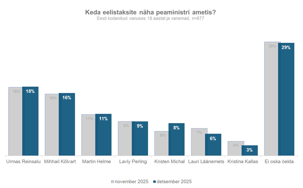Detsembri avaliku arvamuse küsitluse tulemused näitavad, et Eesti kodanike hinnangutes sobivaimale peaministrile ei ole võrreldes eelmise kuuga toimunud märkimisväärseid muutusi.
