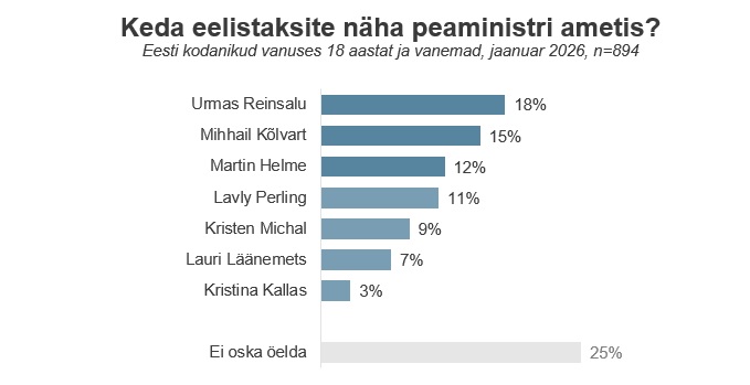 Turu-uuringute AS-i 2026. aasta jaanuaris läbi viidud avaliku arvamuse küsitluse järgi peab 18% Eesti valimisealistest kodanikest sobivaimaks peaministriks Urmas Reinsalut. Tema toetus on püsinud muutumatuna juba kolmandat kuud. Teisel kohal asub Mihhail Kõlvart, keda nimetas sobivaimaks peaministriks 15% vastanutest, mis on ühe protsendipunkti võrra vähem kui detsembris.
